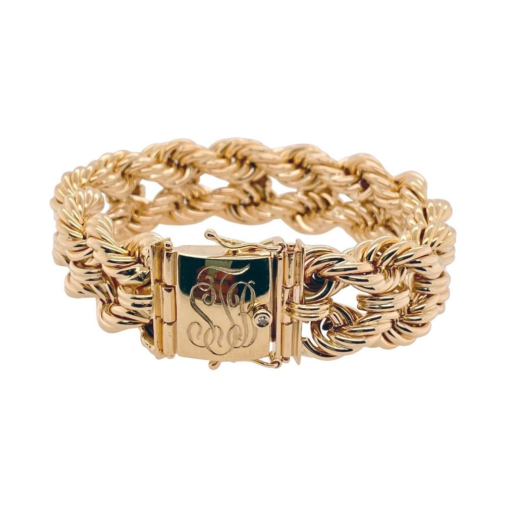 Croghan’s exclusive classic rope chain bracelet, The Club Bracelet! This bracelet is handcrafted in 14K yellow gold featuring double rope chain twists in a braided design and a single diamond accent on the clasp. The clasp is personalized for you with a hand-engraved script monogram or script initials.