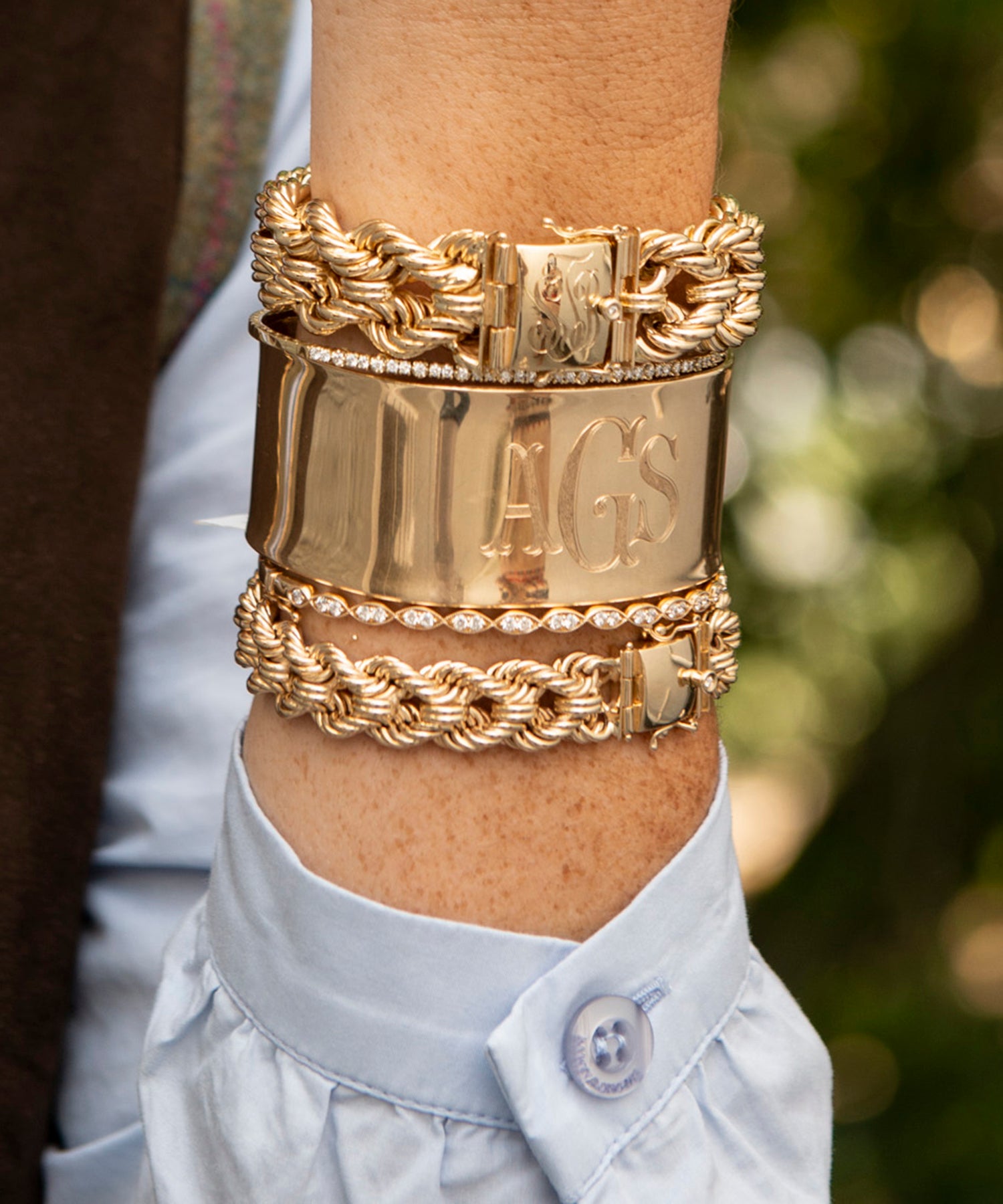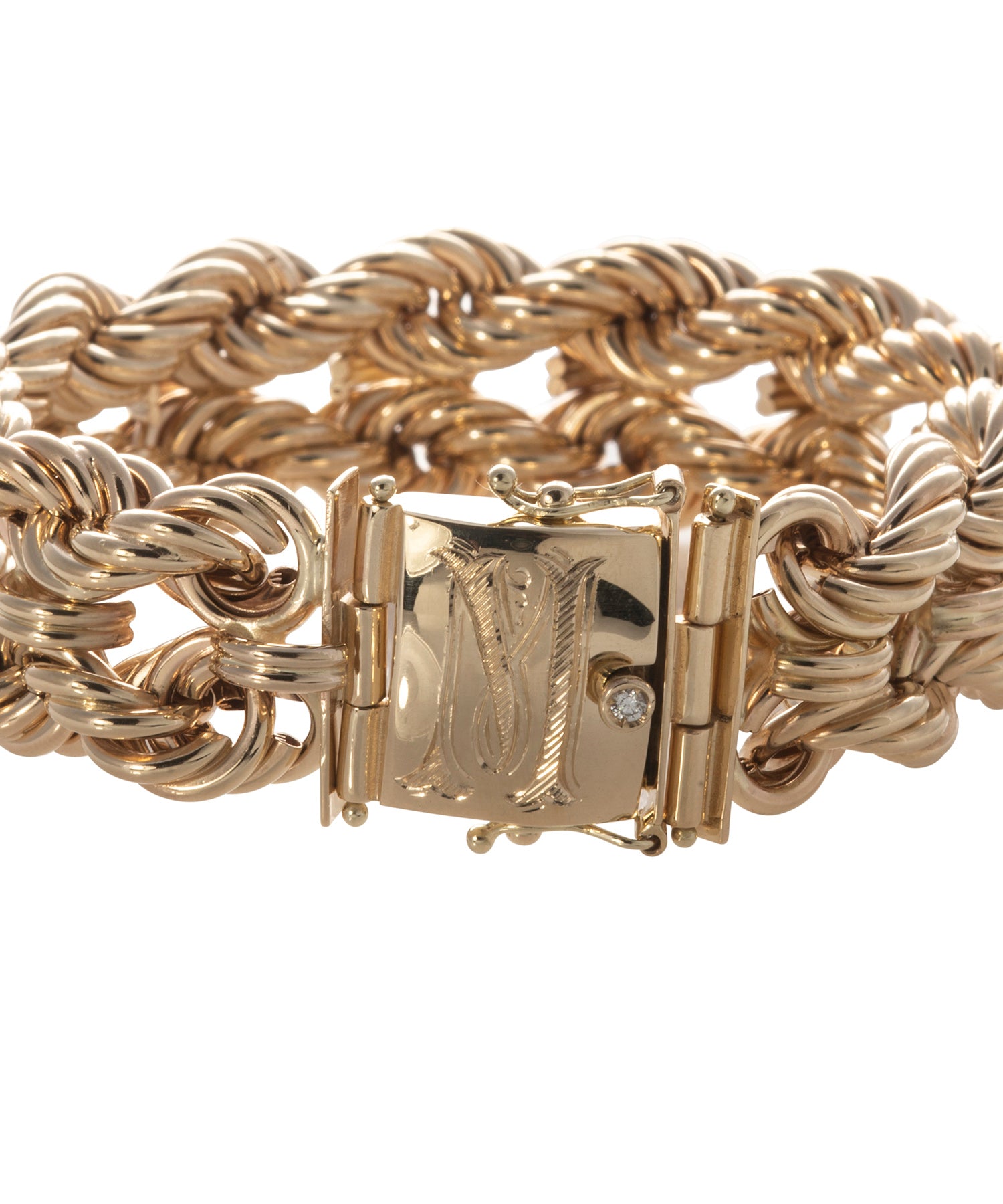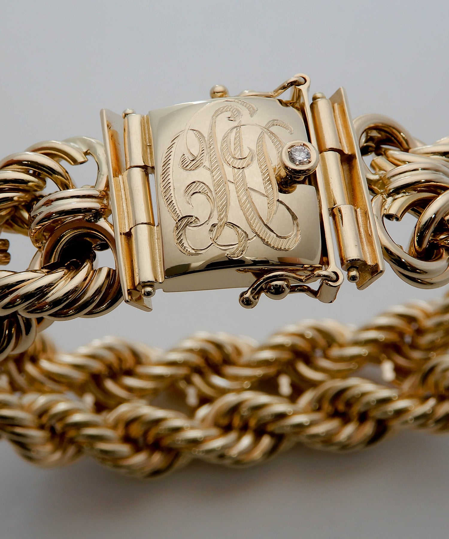Croghan’s exclusive classic rope chain bracelet with a smaller width, The Petite Club Bracelet! This bracelet is handcrafted in 14K yellow gold featuring double rope chain twists in a braided design and a single diamond accent on the clasp. The clasp is personalized for you with a hand-engraved monogram.